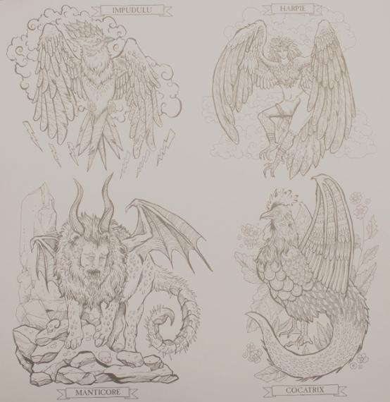 Griffons, dragons, loup - garous, gorgones... chaque créature dessinée fait l'objet d'une petite fiche de présentation de son histoire et de ses pouvoirs.